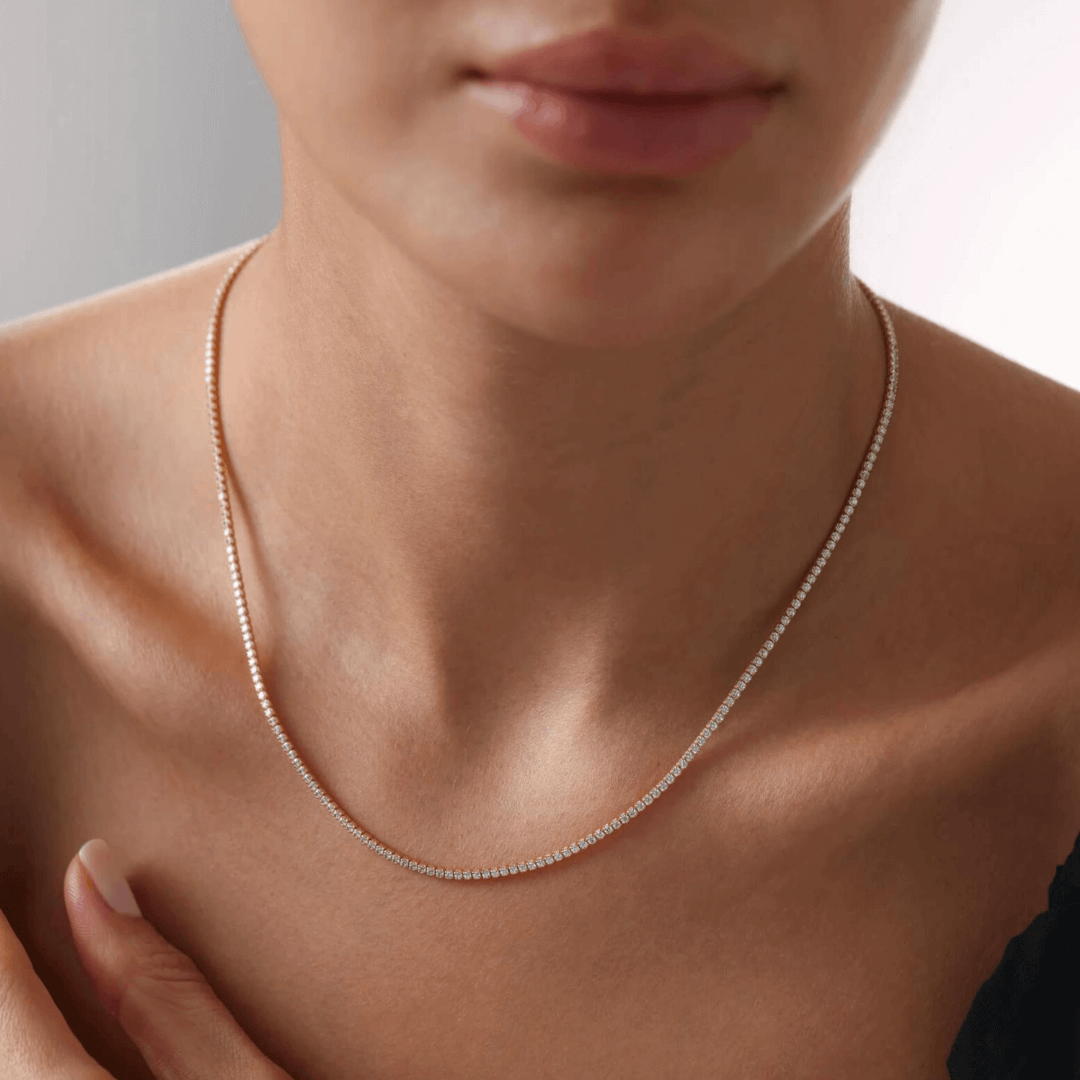 Crafted with 2mm moissanite stones and set in 18k yellow gold vermeil, this tennis necklace delivers endless sparkle. A modern classic made for layering or wearing solo—because luxury should feel effortless.