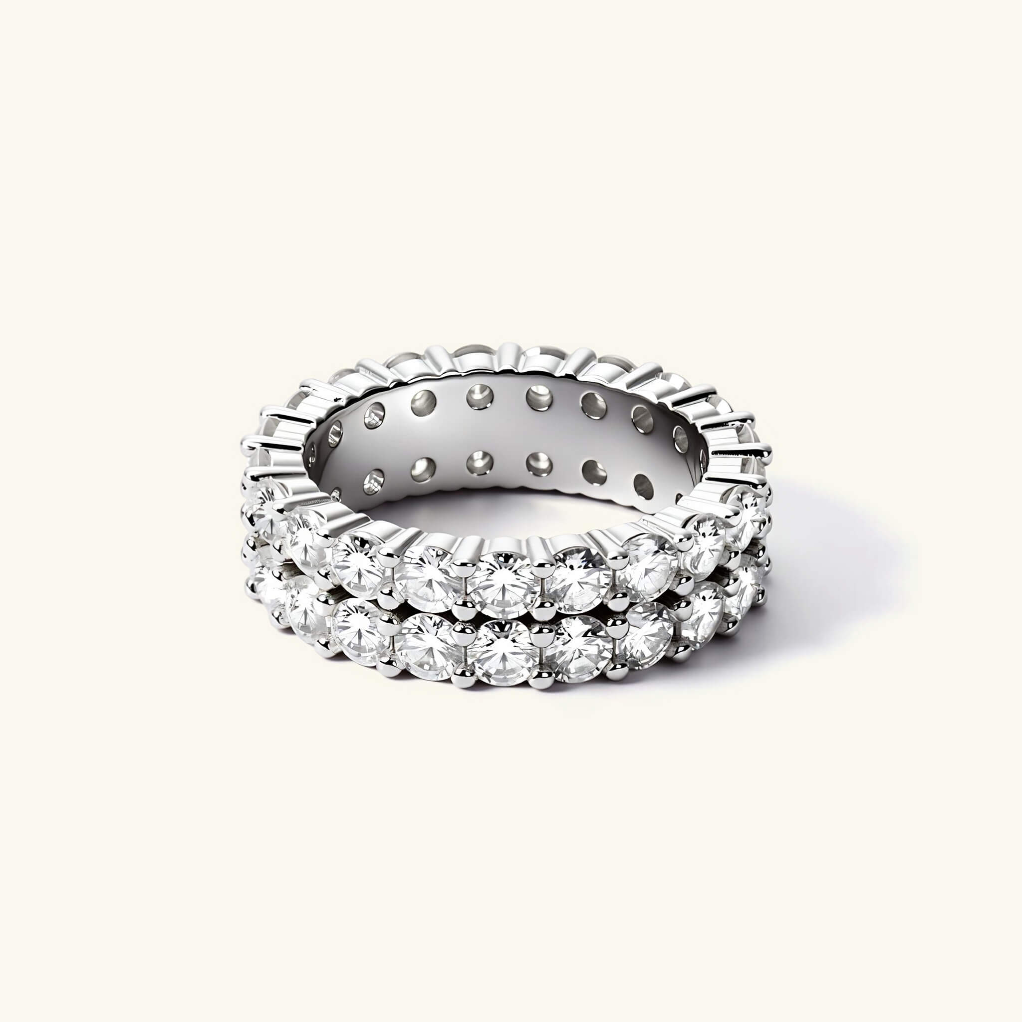 Radiance redefined. The Double Row Moissanite Eternity Ring in 18k white gold vermeil features two rows of dazzling moissanite stones, creating a captivating play of light.