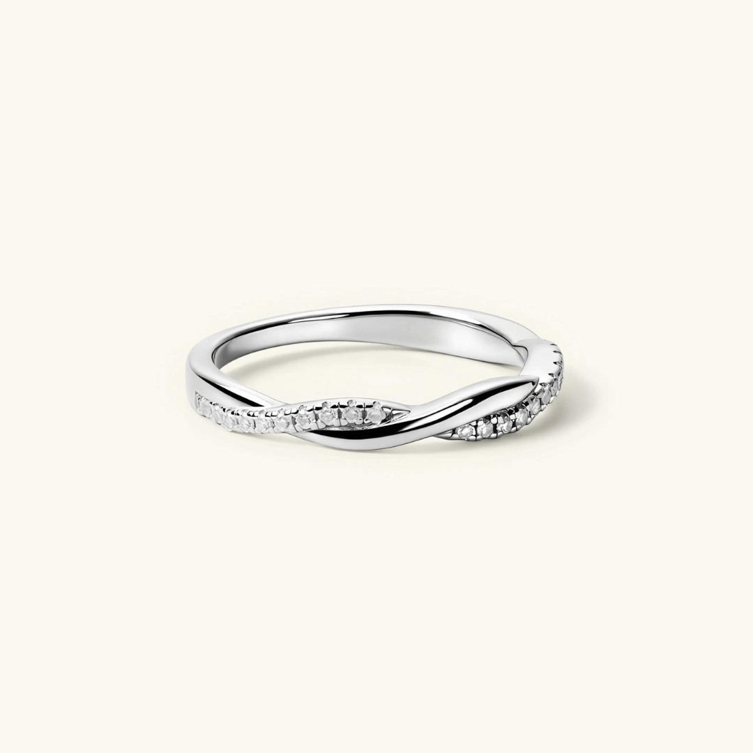 A twist on timeless sparkle. The Moissanite Twisted Ring in 18k gold vermeil features intertwining bands, with one side lined in radiant moissanite stones. Modern, elegant, and perfect for stacking or wearing solo.