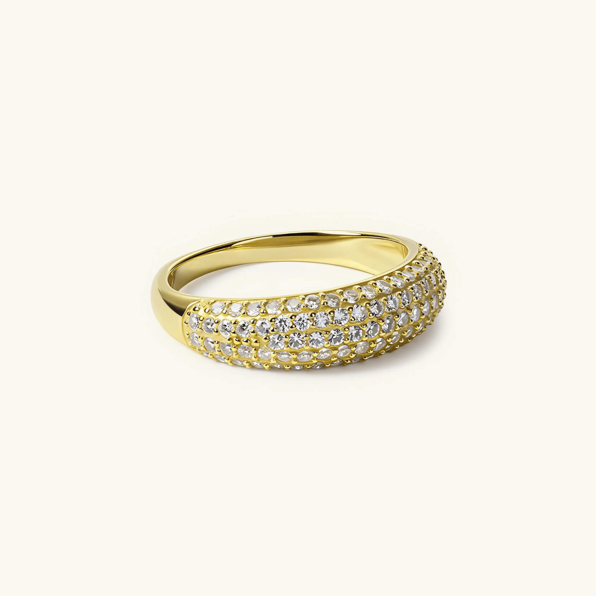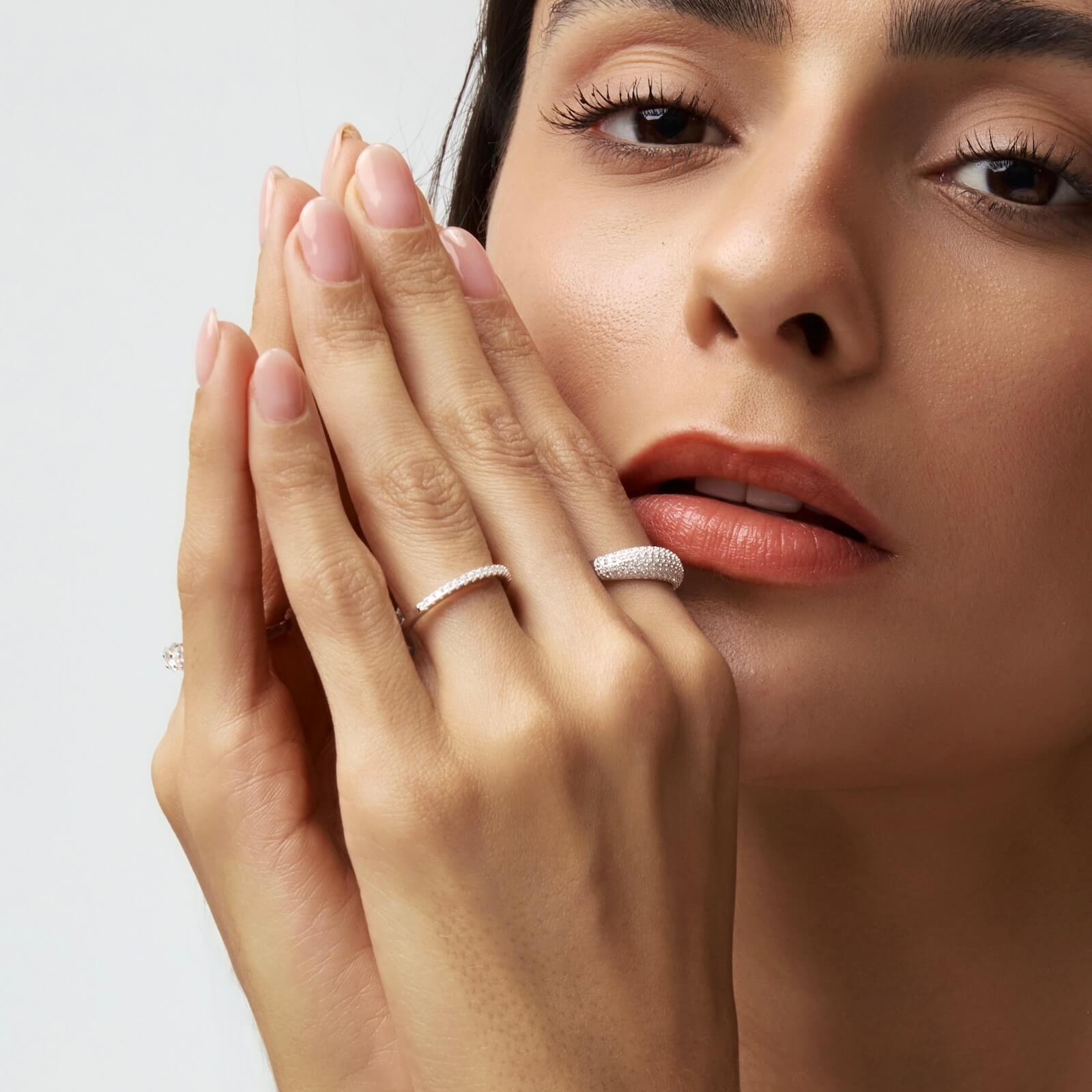 A dome with attitude. Crafted in 18k white gold vermeil, pavé moissanite stones wrap this sleek silhouette in light. It’s polished, modern, and designed for the days you want your jewelry to do the talking.
