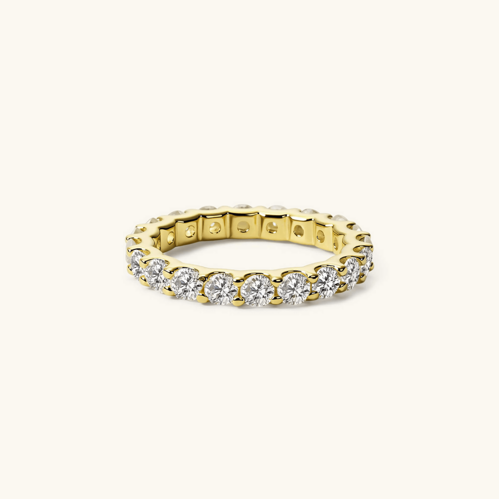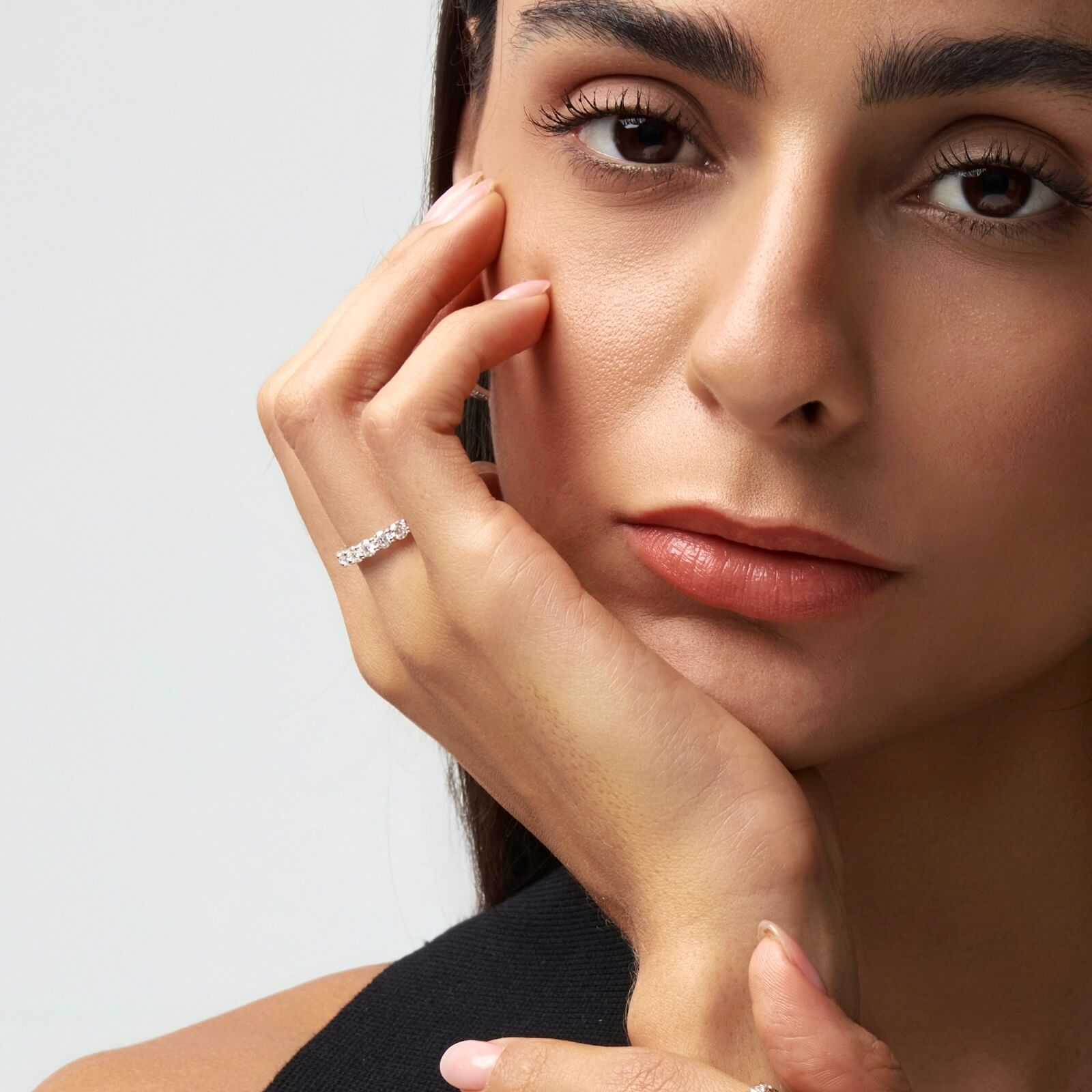 Embodying sophistication, the Moissanite Eternity Ring in 18k white gold vermeil is adorned with a continuous band of shimmering moissanite stones. This ring is designed to captivate with its luminous brilliance and refined simplicity.