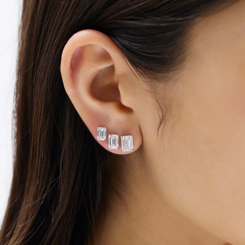 Crafted in 18k yellow gold vermeil, these studs feature emerald-cut moissanite that plays with light in a whole new way. Clean lines meet bold sparkle—perfect for when you want something more refined than round, but just as versatile.