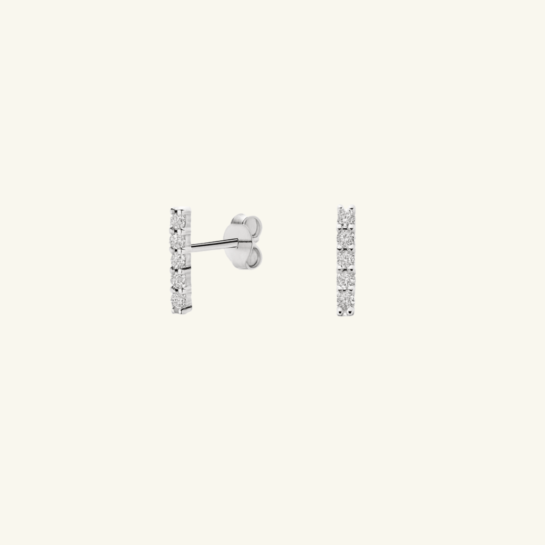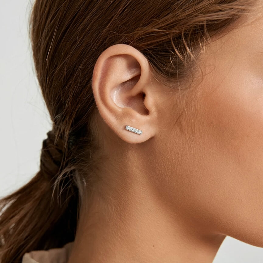 In 18k white gold vermeil, these moissanite bar studs bring a modern edge to your everyday lineup. Lightweight, versatile, and undeniably chic—they’re the studs you’ll reach for on repeat.