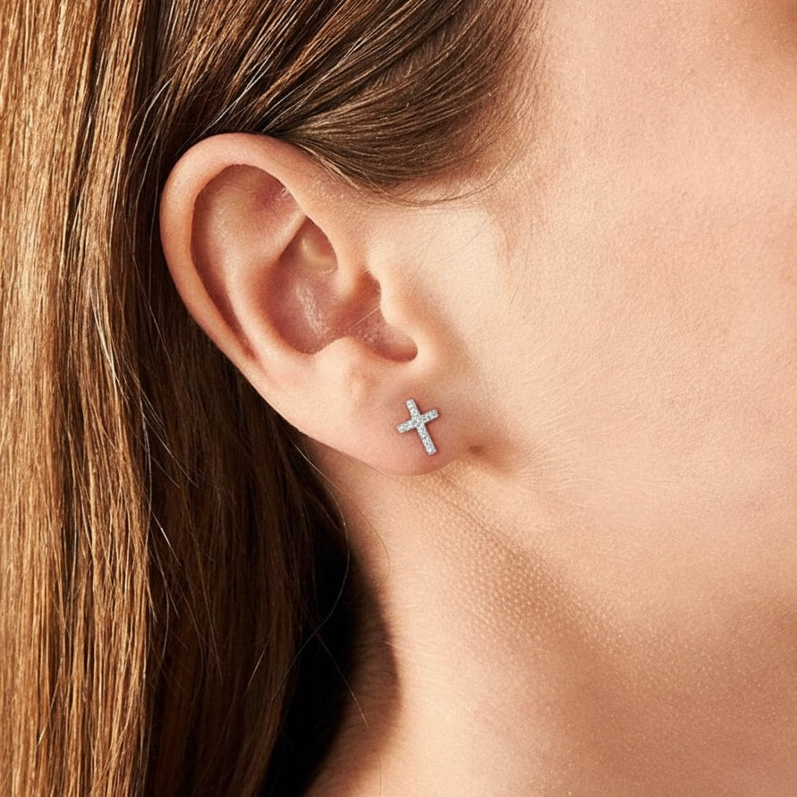 Crafted in 18k white gold vermeil, moissanite stones illuminate a clean cross shape that feels fresh, not traditional. Minimal but striking, these studs are made to stand out in the simplest way possible.